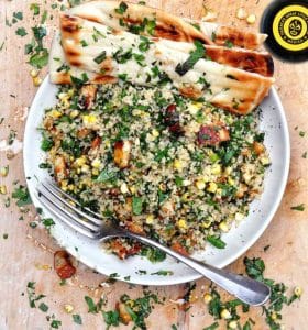 Bring 1 and 1/4 cups of water to a boil in a small sauce pot. Tip the couscous and chickpeas into a bowl and pour over the stock. Set aside for 10 minutes. Place the couscous in a large bowl then pour over the boiling hot stock. Whilst the chickpeas are cooking finely chop the cooked kale, coriander, parsley, mint, chilli, garlic cloves and red onion. To serve top the couscous salad with the crispy, spiced chickpeas. Couscous salad is the perfect party food. Toss through the lemon zest and juice, pepper, almonds and mint. Add couscous and stir, cooking for 1 minute. Pour over 1 cup boiling water. 1 mango, peeled and diced. Taste for seasoning and adjust with salt and/or pepper as needed. Add some sea salt to taste and a tablespoon of oil.